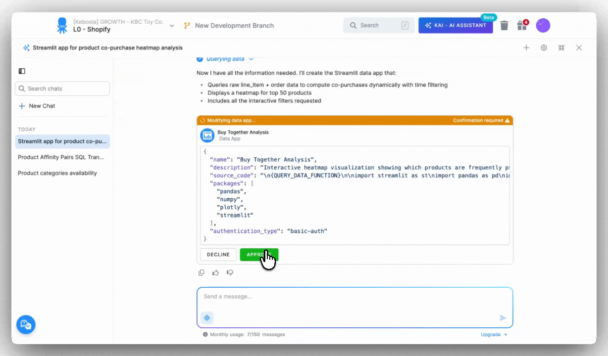 Over the next 90 seconds, Kai analyzed the table structure, wrote the Python/Streamlit code, created the Plotly heatmap, built all filter components, added a data freshness indicator, and deployed the app. All automatically deployed to Keboola's hosting infrastructure.