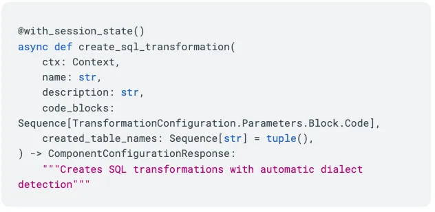 Intelligent Error Recovery: Our @tool_errors() decorator wraps each tool with contextual error handling that not only logs failures but provides recovery instructions to the AI. When a transformation fails due to a missing table, the AI receives actionable guidance on how to resolve the issue.