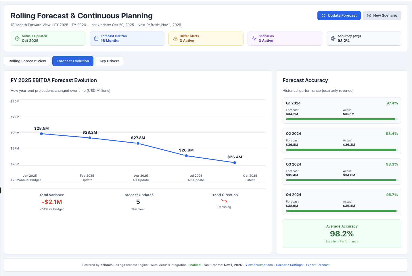 Rolling forecasts extend the horizon continuously, rather than sticking to fiscal year boundaries. It’s a mindset shift – always looking 4–6 quarters ahead, not just to year-end. While quarterly forecasts are a good step, they often still focus on the current year. Rolling adds that next quarter or two beyond, which is crucial for strategic planning (it prevents the “cliff” where you stop forecasting in December and only start again in next year’s Q1). Also, rolling tends to be more frequent (some do it monthly lightly). The value is in early warning – you spot trends that affect next year, not just reacting within the year. And yes, many leading companies have adopted it because it improves agility. Tools like Keboola make the process far less painful than Excel, which is why it becomes feasible to do it continuously.